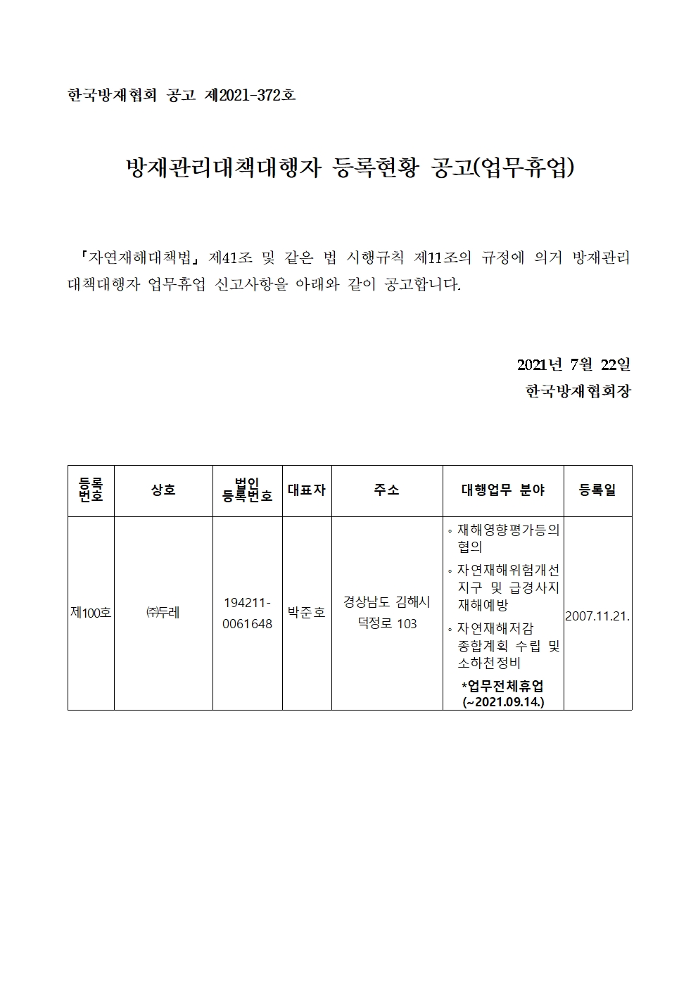 방재관리대책대행자 등록현황 공고(업무휴업) - (주)두레 2021-07-22 공고문_제2021-372호_방재대행자 등록현황 공고(휴업)_(주)두레.pdf (60322K) 목록보기 이전글방재관리대책대행자 등록현황 공고(변경등록) - (주)동해종합기술공사2021.07.26 다음글방재관리대책대행자 등록현황 공고(변경등록) - (주)두레2021.07.22