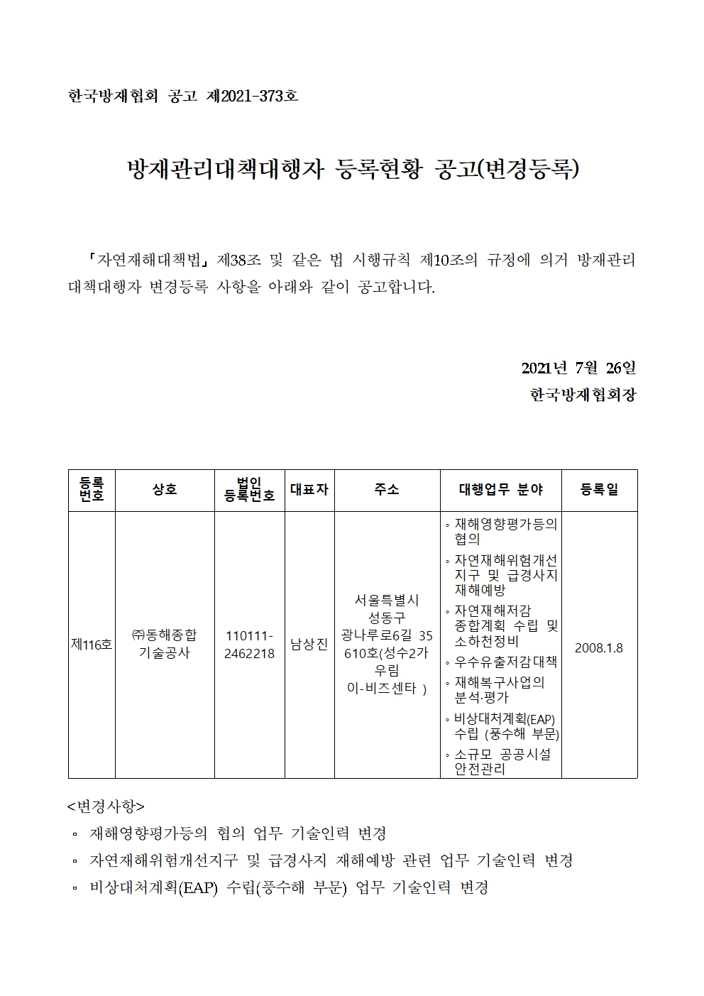 방재관리대책대행자 등록현황 공고(변경등록) - (주)동해종합기술공사 2021-07-26 공고문_제2021-373호_방재대행자 등록현황 공고(변경)_(주)동해종합기술공사.pdf (74704K) 목록보기 이전글방재관리대책대행자 등록현황 공고(변경등록) - (주)한백종합기술공사2021.07.26 다음글방재관리대책대행자 등록현황 공고(업무휴업) - (주)두레2021.07.22