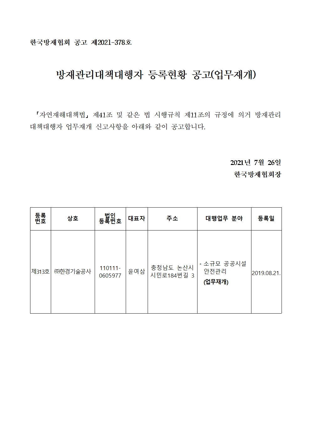 방재관리대책대행자 등록현황 공고(업무재개) - (주)한경기술공사 2021-07-26 공고문_제2021-378호_방재대행자 등록현황 공고(재개)_(주)한경기술공사.pdf (54880K) 목록보기 이전글방재관리대책대행자 등록현황 공고(업무휴업) - (주)한경기술공사2021.07.26 다음글방재관리대책대행자 등록현황 공고(업무휴업) - (주)한경기술공사2021.07.26