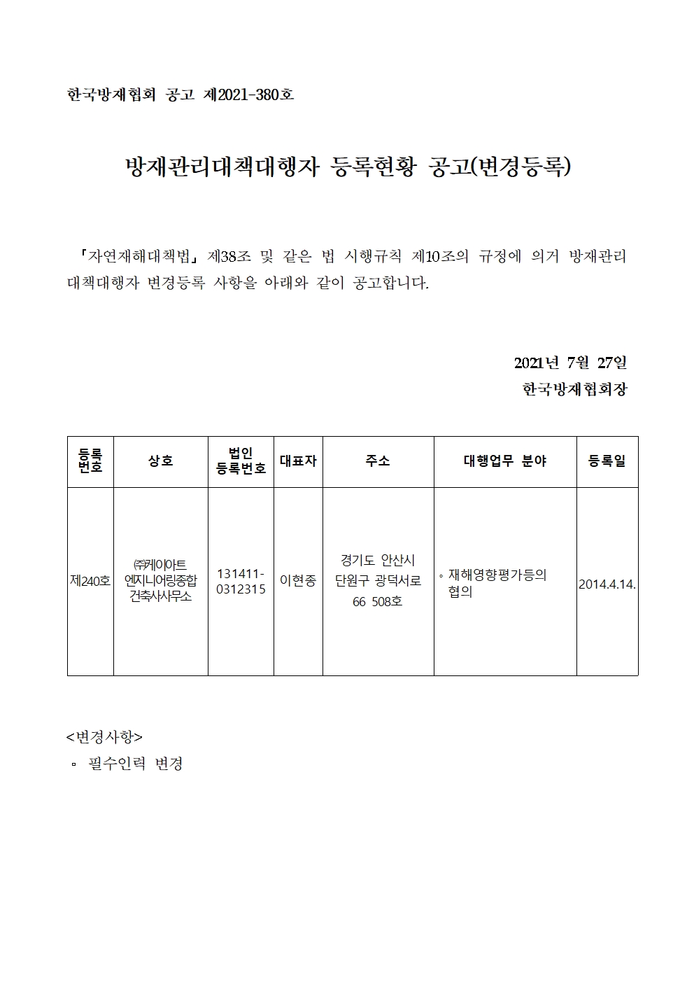 방재관리대책대행자 등록현황 공고(변경등록) - (주)케이아트엔지니어링종합건축사사무소 2021-07-28 공고문_제2021-380호_방재대행자 등록현황 공고(변경)_(주)케이아트엔지니어링종합건축사사무소.pdf (58193K) 목록보기 이전글방재관리대책대행자 등록현황 공고(변경등록) - (주)용두2021.07.28 다음글방재관리대책대행자 등록현황 공고(업무휴업) - (주)한경기술공사2021.07.26