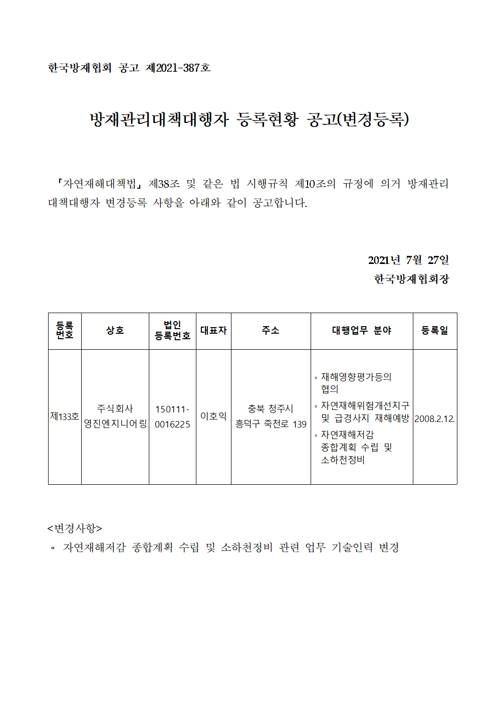 방재관리대책대행자 등록현황 공고(변경등록) - 주식회사 영진엔지니어링 2021-07-28 공고문_제2021-387호_방재대행자 등록현황 공고(변경)_주식회사 영진엔지니어링.pdf (64382K) 목록보기 이전글방재관리대책대행자 등록현황 공고(업무휴업) - 주식회사 영진엔지니어링2021.07.28 다음글방재관리대책대행자 등록현황 공고(변경등록) - (주)한울2021.07.28