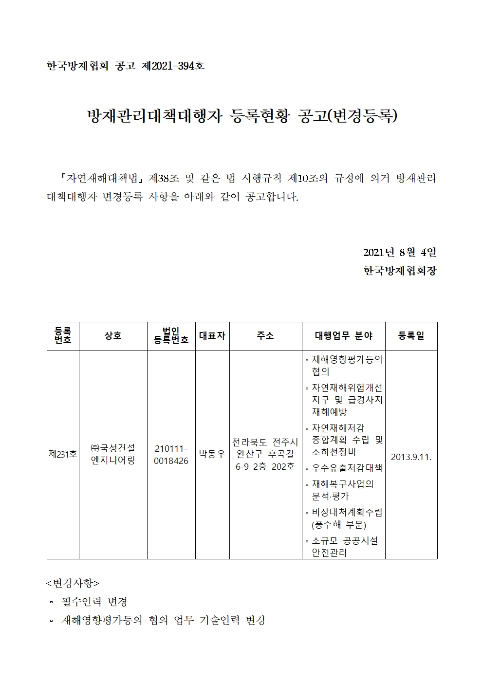 방재관리대책대행자 등록현황 공고(변경등록) - (주)국성건설엔지니어링 2021-08-04 공고문_제2021-394호_방재대행자 등록현황 공고(변경)_(주)국성건설엔지니어링.pdf (69278K) 목록보기 이전글방재관리대책대행자 등록현황 공고(변경등록) - (주)우경엔지니어링2021.08.04 다음글방재관리대책대행자 등록현황 공고(신규등록) - 주식회사동해2021.08.04
