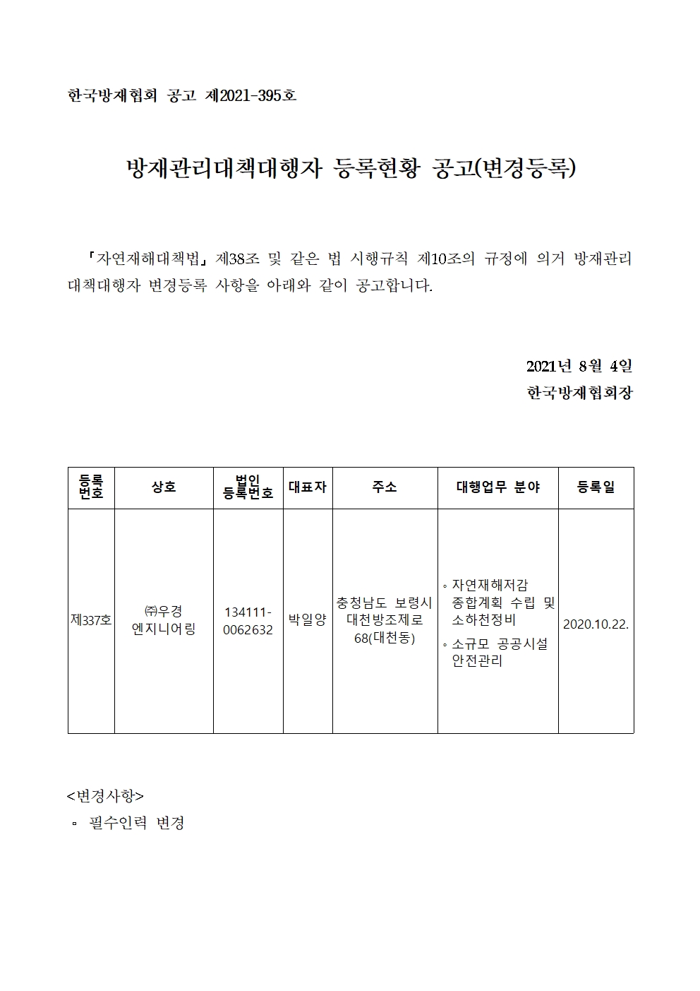 방재관리대책대행자 등록현황 공고(변경등록) - (주)우경엔지니어링 2021-08-04 공고문_제2021-395호_방재대행자 등록현황 공고(변경)_(주)우경엔지니어링.pdf (61257K) 목록보기 이전글방재관리대책대행자 등록현황 공고(업무휴업) - (주)우경엔지니어링2021.08.04 다음글방재관리대책대행자 등록현황 공고(변경등록) - (주)국성건설엔지니어링2021.08.04