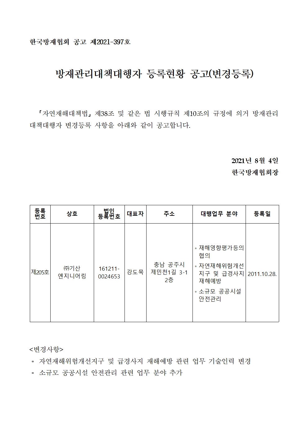 방재관리대책대행자 등록현황 공고(변경등록) - (주)기산엔지니어링 2021-08-04 공고문_제2021-397호_방재대행자 등록현황 공고(변경)_(주)기산엔지니어링.pdf (64681K) 목록보기 이전글방재관리대책대행자 등록현황 공고(변경등록) - (주)정림이엔씨건축사사무소2021.08.10 다음글방재관리대책대행자 등록현황 공고(업무휴업) - (주)우경엔지니어링2021.08.04