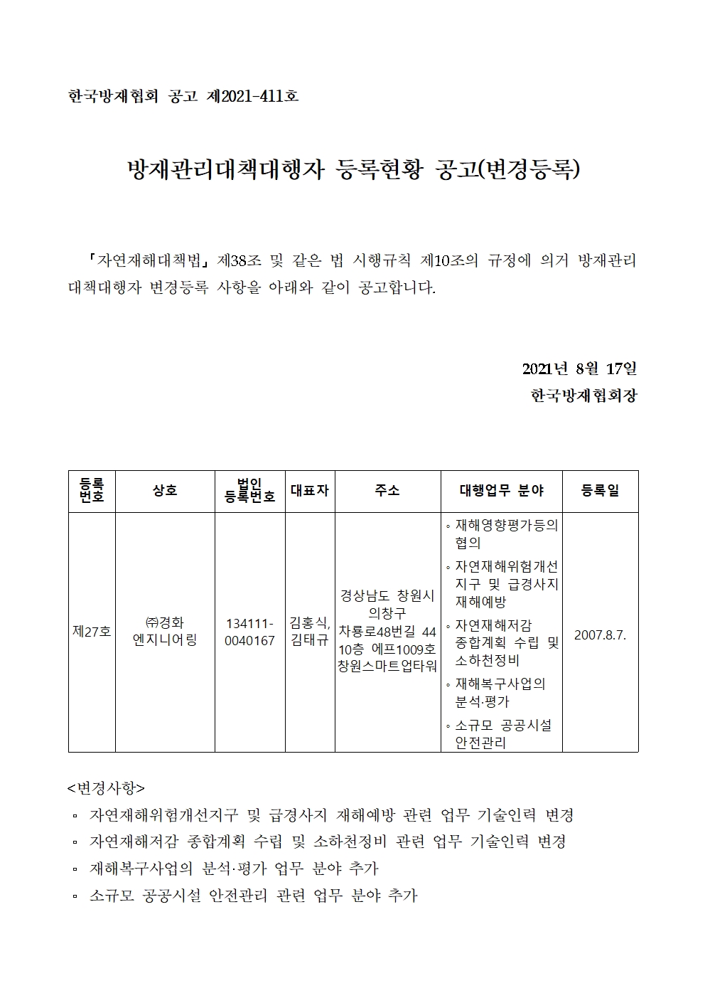 방재관리대책대행자 등록현황 공고(변경등록) - (주)경화엔지니어링 2021-08-17 공고문_제2021-411호_방재대행자 등록현황 공고(변경)_(주)경화엔지니어링.pdf (74459K) 목록보기 이전글방재관리대책대행자 등록현황 공고(변경등록) - (주)우주엔지니어링2021.08.18 다음글방재관리대책대행자 등록현황 공고(변경등록) - 주식회사 영진엔지니어링2021.08.17