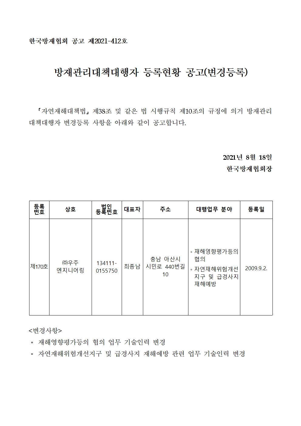 방재관리대책대행자 등록현황 공고(변경등록) - (주)우주엔지니어링 2021-08-18 공고문_제2021-412호_방재대행자 등록현황 공고(변경)_(주)우주엔지니어링.pdf (61569K) 목록보기 이전글방재관리대책대행자 등록현황 공고(신규등록) - 주식회사 정안2021.08.19 다음글방재관리대책대행자 등록현황 공고(변경등록) - (주)경화엔지니어링2021.08.17