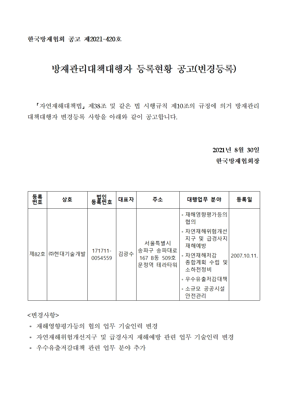 방재관리대책대행자 등록현황 공고(변경등록) - (주)현대기술개발 2021-08-30 공고문_제2021-420호_방재대행자 등록현황 공고(변경)_(주)현대기술개발.pdf (70510K) 목록보기 이전글방재관리대책대행자 등록현황 공고(변경등록) - 주식회사 영진엔지니어링2021.09.03 다음글방재관리대책대행자 등록현황 공고(변경등록) - 주식회사 해인엔지니어링건축사사무소2021.08.24