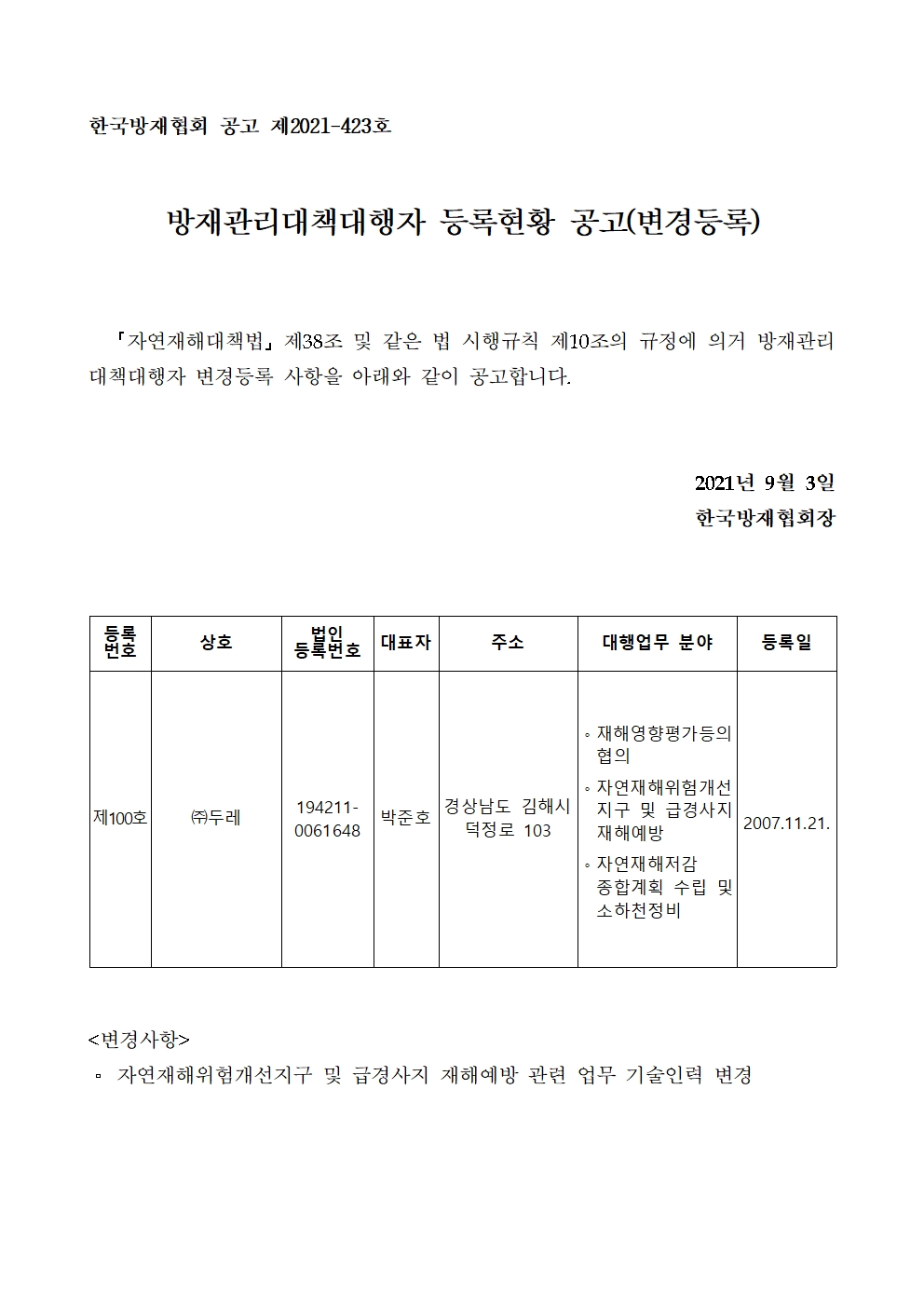 방재관리대책대행자 등록현황 공고(변경등록) - (주)두레 2021-09-03 공고문_제2021-423호_방재대행자 등록현황 공고(변경)_(주)두레.pdf (62886K) 목록보기 이전글방재관리대책대행자 등록현황 공고(변경등록) - 주식회사 수성이앤씨건축사사무소2021.09.03 다음글방재관리대책대행자 등록현황 공고(변경등록) - 주식회사 영진엔지니어링2021.09.03