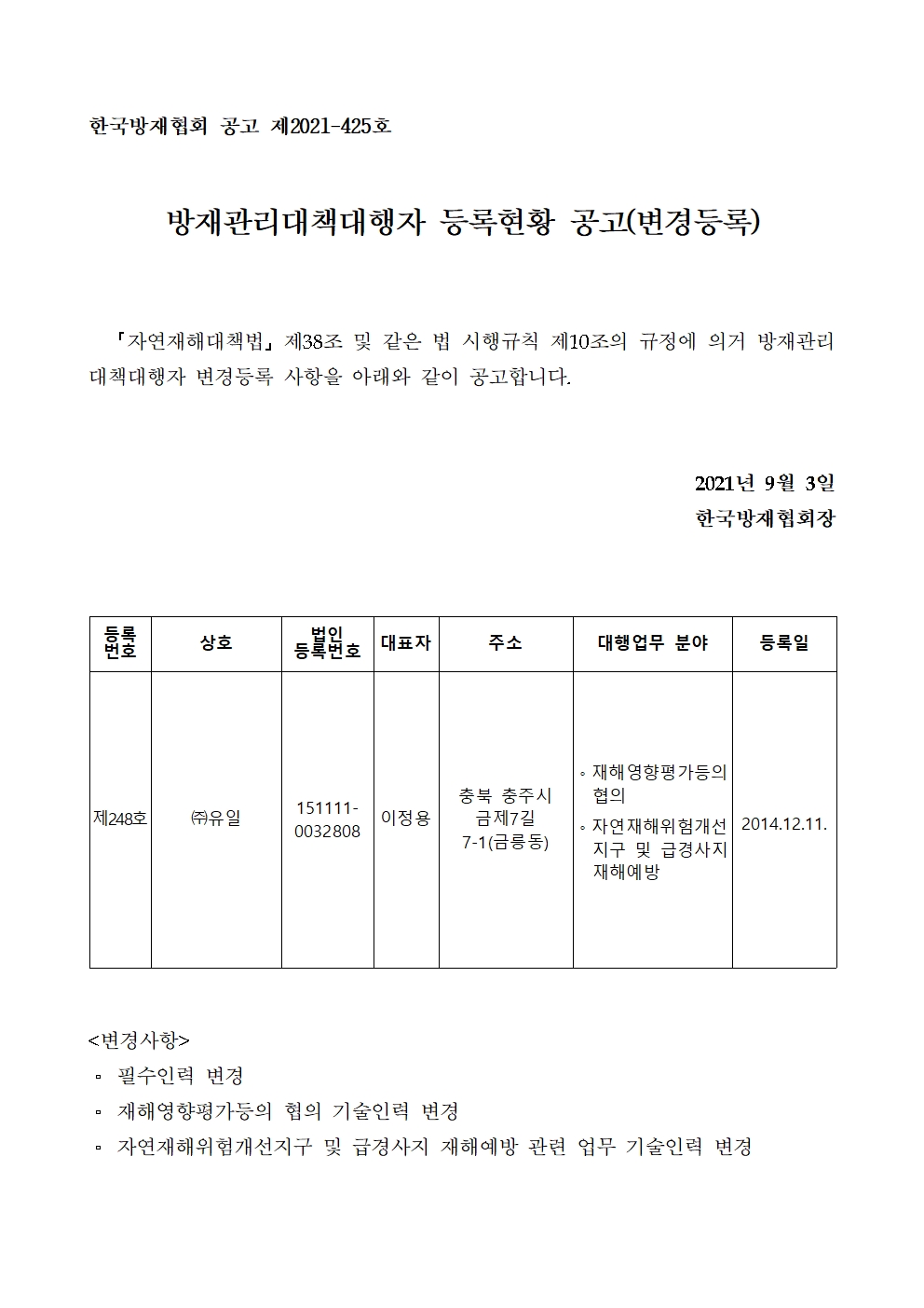 방재관리대책대행자 등록현황 공고(변경등록) - (주)유일 2021-09-03 공고문_제2021-425호_방재대행자 등록현황 공고(변경)_(주)유일.pdf (62066K) 목록보기 이전글방재관리대책대행자 등록현황 공고(변경등록) - (주)우진2021.09.09 다음글방재관리대책대행자 등록현황 공고(변경등록) - 주식회사 수성이앤씨건축사사무소2021.09.03