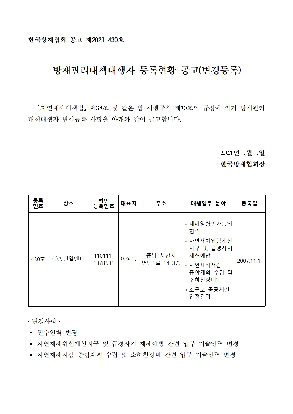 방재관리대책대행자 등록현황 공고(변경등록) - (주)송현알앤디 2021-09-09 공고문_제2021-430호_방재대행자 등록현황 공고(변경)_(주)송현알앤디.pdf (67309K) 목록보기 이전글방재관리대책대행자 등록현황 공고(변경등록) - (주)경호엔지니어링종합건축사사무소2021.09.09 다음글방재관리대책대행자 등록현황 공고(변경등록) - (주)도시미래종합기술공사2021.09.09