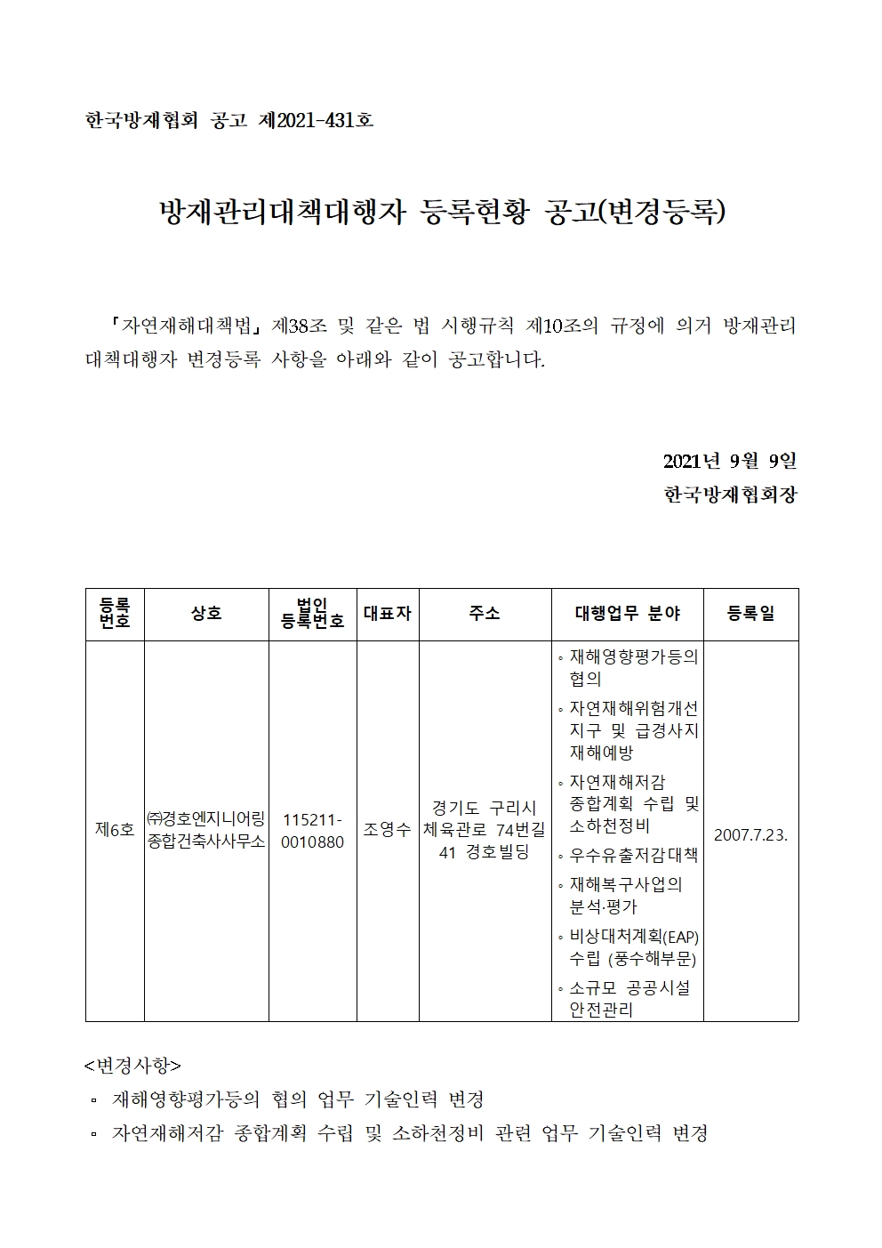 방재관리대책대행자 등록현황 공고(변경등록) - (주)경호엔지니어링종합건축사사무소 2021-09-09 공고문_제2021-431호_방재대행자 등록현황 공고(변경)_(주)경호엔지니어링종합건축사사무소.pdf (70712K) 목록보기 이전글방재관리대책대행자 등록현황 공고(변경등록) - (주)해동기술개발2021.09.09 다음글방재관리대책대행자 등록현황 공고(변경등록) - (주)송현알앤디2021.09.09