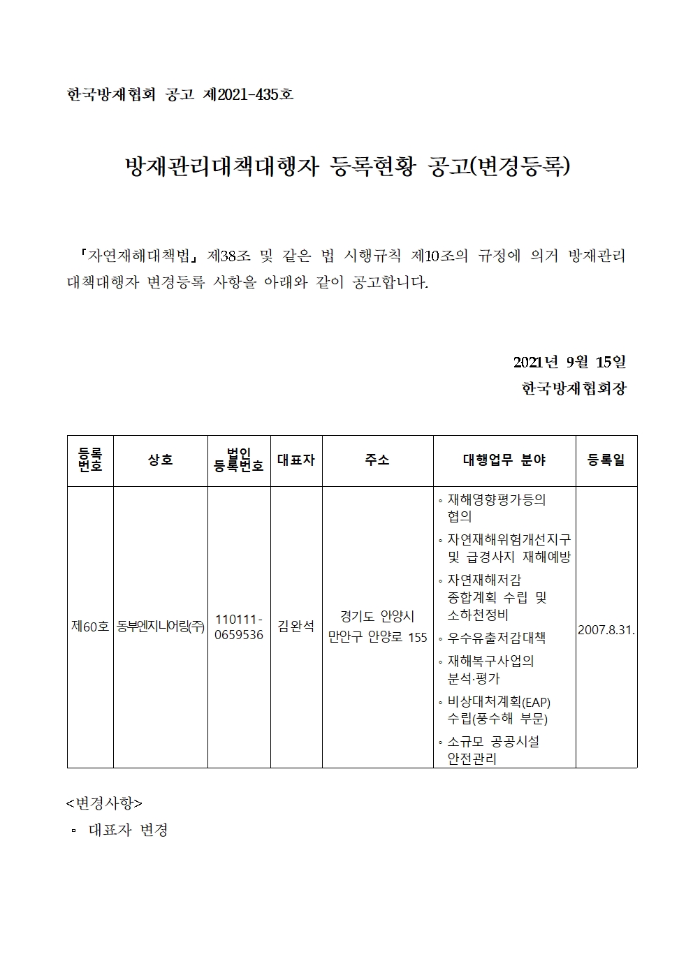 방재관리대책대행자 등록현황 공고(변경등록) - 동부엔지니어링(주) 2021-09-15 공고문_제2021-435호_방재대행자 등록현황 공고(변경)_동부엔지니어링(주).pdf (65806K) 목록보기 이전글방재관리대책대행자 등록현황 공고(변경등록) - 주식회사 유한이앤씨2021.09.17 다음글방재관리대책대행자 등록현황 공고(신규등록) - (주)건일2021.09.14