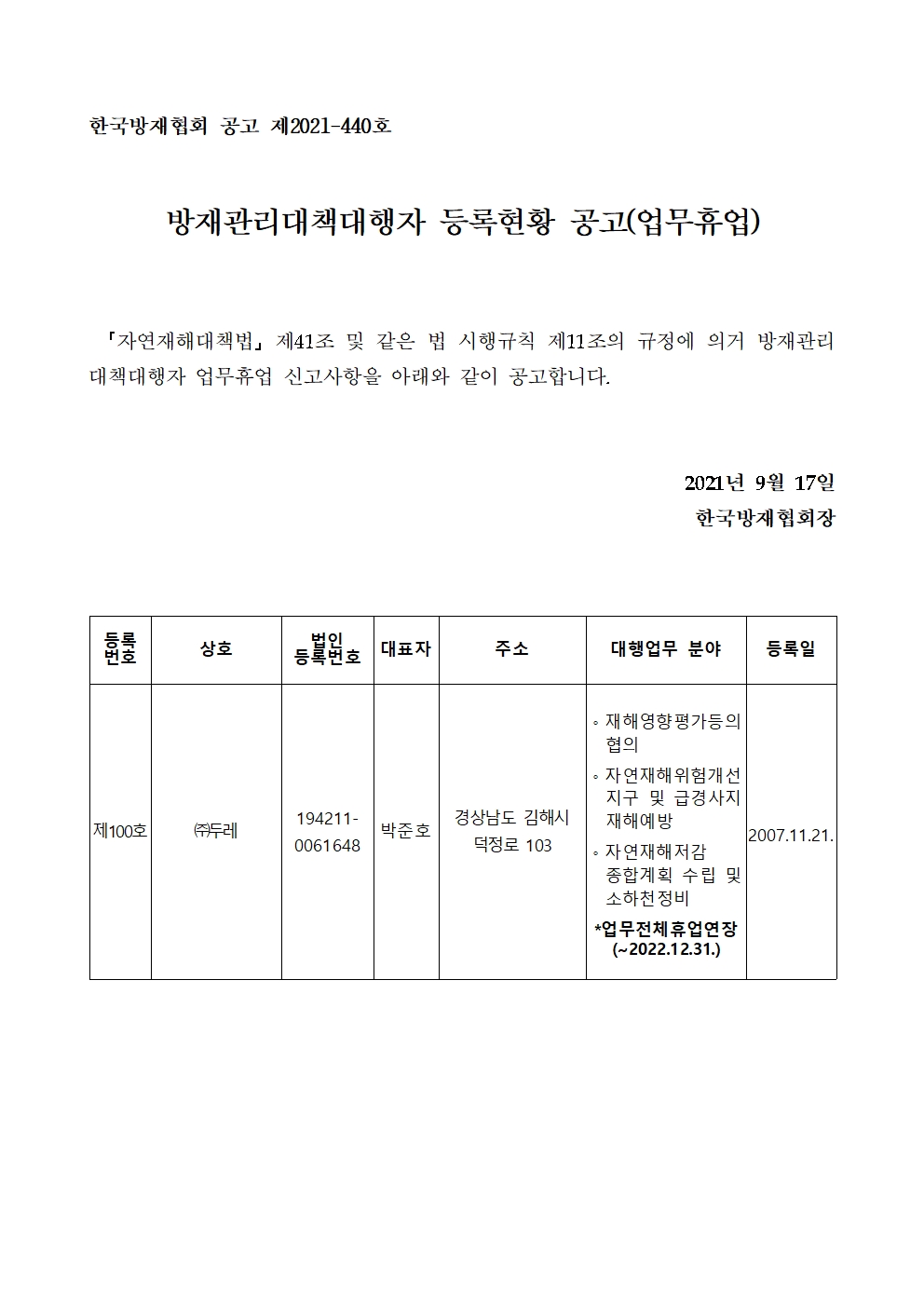 방재관리대책대행자 등록현황 공고(업무휴업) - (주)두레 2021-09-17 공고문_제2021-440호_방재대행자 등록현황 공고(휴업)_(주)두레.pdf (61132K) 목록보기 이전글방재관리대책대행자 등록현황 공고(업무휴업) - (주)서경엔지니어링2021.09.17 다음글방재관리대책대행자 등록현황 공고(변경등록) - (주)한국건설안전협회2021.09.17