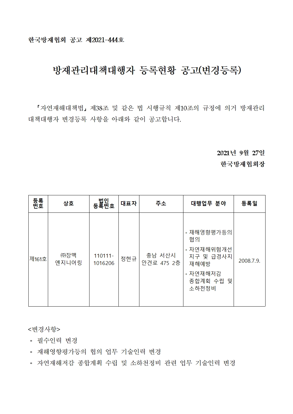 방재관리대책대행자 등록현황 공고(변경등록) - (주)장맥엔지니어링 2021-09-27 공고문_제2021-444호_방재대행자 등록현황 공고(변경)_(주)장맥엔지니어링.pdf (65862K) 목록보기 이전글방재관리대책대행자 등록현황 공고(변경등록) - (주)나우엔지니어링2021.09.27 다음글방재관리대책대행자 등록현황 공고(변경등록) - (주)건화2021.09.27