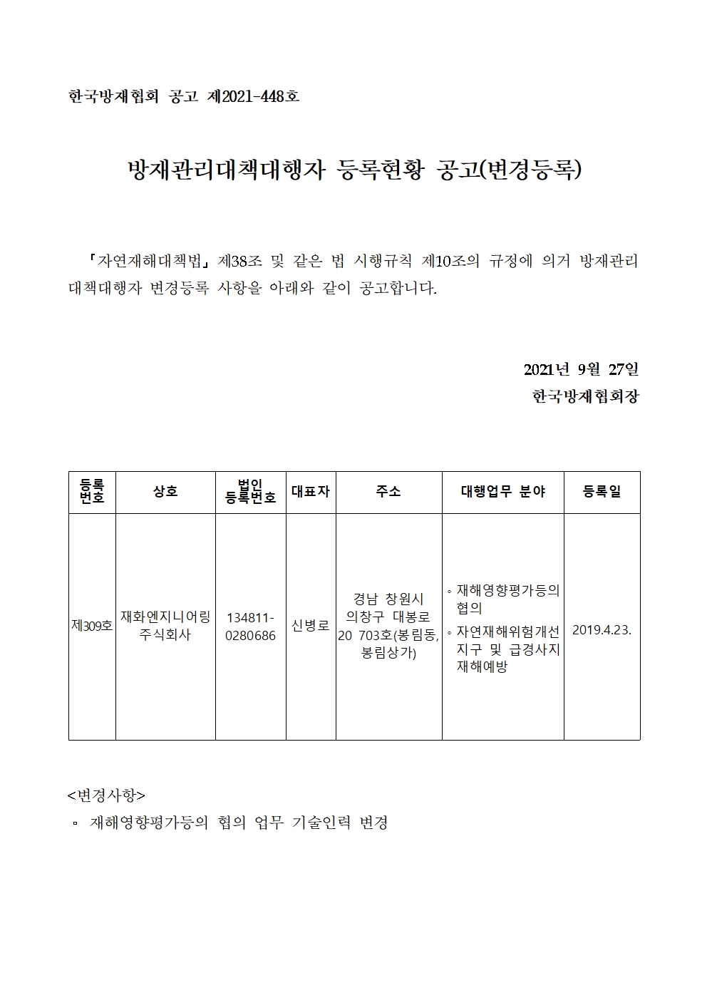 방재관리대책대행자 등록현황 공고(변경등록) - 재화엔지니어링 주식회사 2021-09-27 공고문_제2021-448호_방재대행자 등록현황 공고(변경)_재화엔지니어링 주식회사.pdf (61315K) 목록보기 이전글방재관리대책대행자 등록현황 공고(변경등록) - (주)보원엔지니어링종합건축사사무소2021.09.29 다음글방재관리대책대행자 등록현황 공고(변경등록) - (주)경기방재연구소2021.09.27