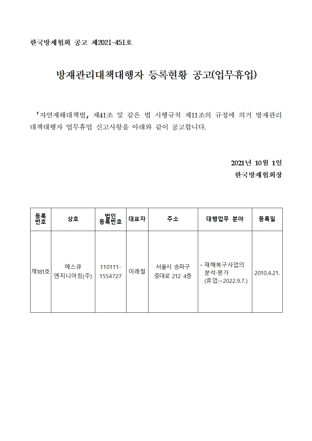 방재관리대책대행자 등록현황 공고(업무휴업) - 에스큐엔지니어링(주) 2021-10-01 공고문_제2021-451호_방재대행자 등록현황 공고(휴업)_에스큐엔지니어링(주).pdf (54391K) 목록보기 이전글방재관리대책대행자 등록현황 공고(변경등록) - (주)청마2021.10.05 다음글방재관리대책대행자 등록현황 공고(변경등록) - 에스큐엔지니어링(주)2021.10.01