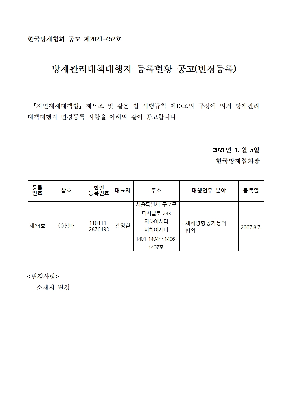 방재관리대책대행자 등록현황 공고(변경등록) - (주)청마 2021-10-05 공고문_제2021-452호_방재대행자 등록현황 공고(변경)_(주)청마.pdf (55458K) 목록보기 이전글방재관리대책대행자 등록현황 공고(변경등록) - (주)세종방재연구소2021.10.05 다음글방재관리대책대행자 등록현황 공고(업무휴업) - 에스큐엔지니어링(주)2021.10.01