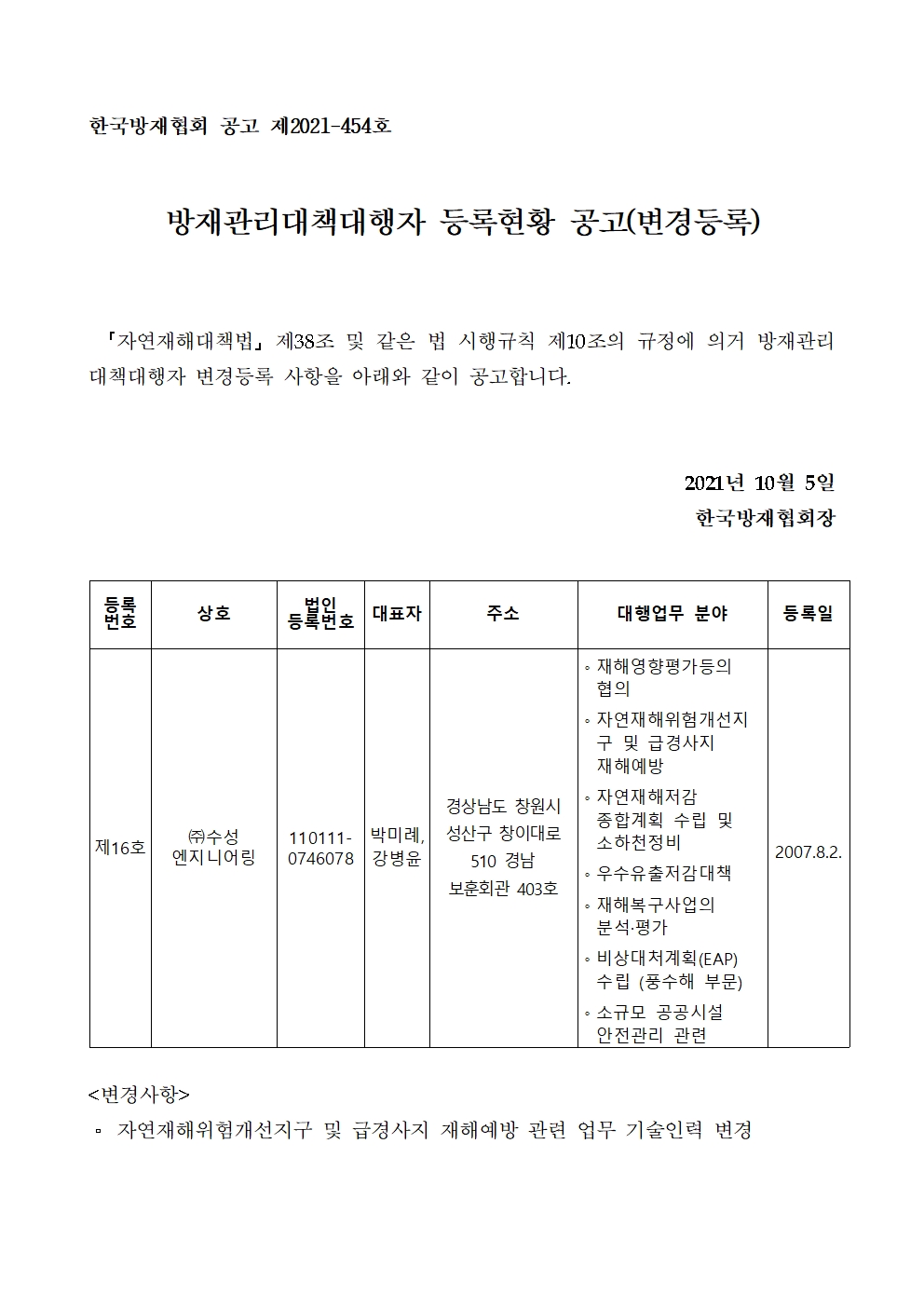 방재관리대책대행자 등록현황 공고(변경등록) - (주)수성엔지니어링 2021-10-05 공고문_제2021-454호_방재대행자 등록현황 공고(변경)_(주)수성엔지니어링.pdf (70281K) 목록보기 이전글방재관리대책대행자 등록현황 공고(변경등록) - (주)원우기술개발2021.10.05 다음글방재관리대책대행자 등록현황 공고(변경등록) - (주)세종방재연구소2021.10.05