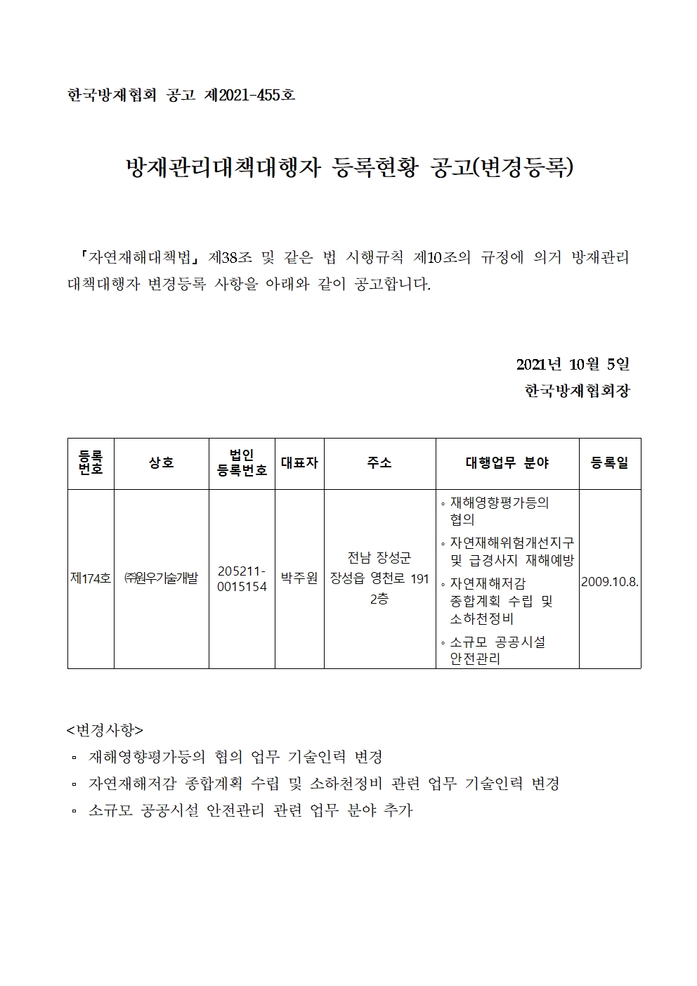 방재관리대책대행자 등록현황 공고(변경등록) - (주)원우기술개발 2021-10-05 공고문_제2021-455호_방재대행자 등록현황 공고(변경)_(주)원우기술개발.pdf (67758K) 목록보기 이전글방재관리대책대행자 등록현황 공고(변경등록) - (주)경동엔지니어링2021.10.05 다음글방재관리대책대행자 등록현황 공고(변경등록) - (주)수성엔지니어링2021.10.05