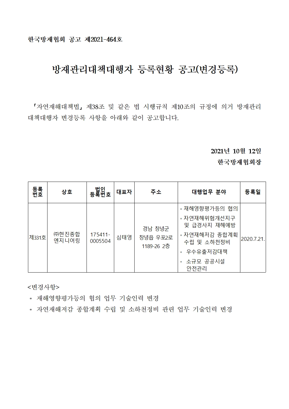 방재관리대책대행자 등록현황 공고(변경등록) - (주)현진종합엔지니어링 2021-10-12 공고문_제2021-464호_방재대행자 등록현황 공고(변경)_(주)현진종합엔지니어링.pdf (67910K) 목록보기 이전글방재관리대책대행자 등록현황 공고(변경등록) - (주)우빈기술공사2021.10.12 다음글방재관리대책대행자 등록현황 공고(변경등록) - 대현기술개발 주식회사2021.10.12