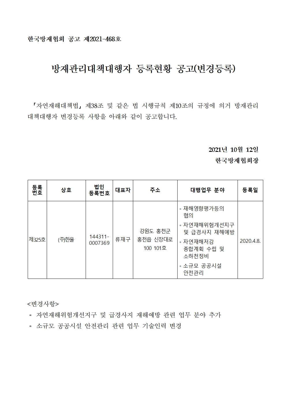 방재관리대책대행자 등록현황 공고(변경등록) - (주)한울 2021-10-12 공고문_제2021-468호_방재대행자 등록현황 공고(변경)_(주)한울.pdf (66257K) 목록보기 이전글방재관리대책대행자 등록현황 공고(변경등록) - (주)한국종합엔지니어링2021.10.12 다음글방재관리대책대행자 등록현황 공고(변경등록) - (주)예당엔지니어링2021.10.12
