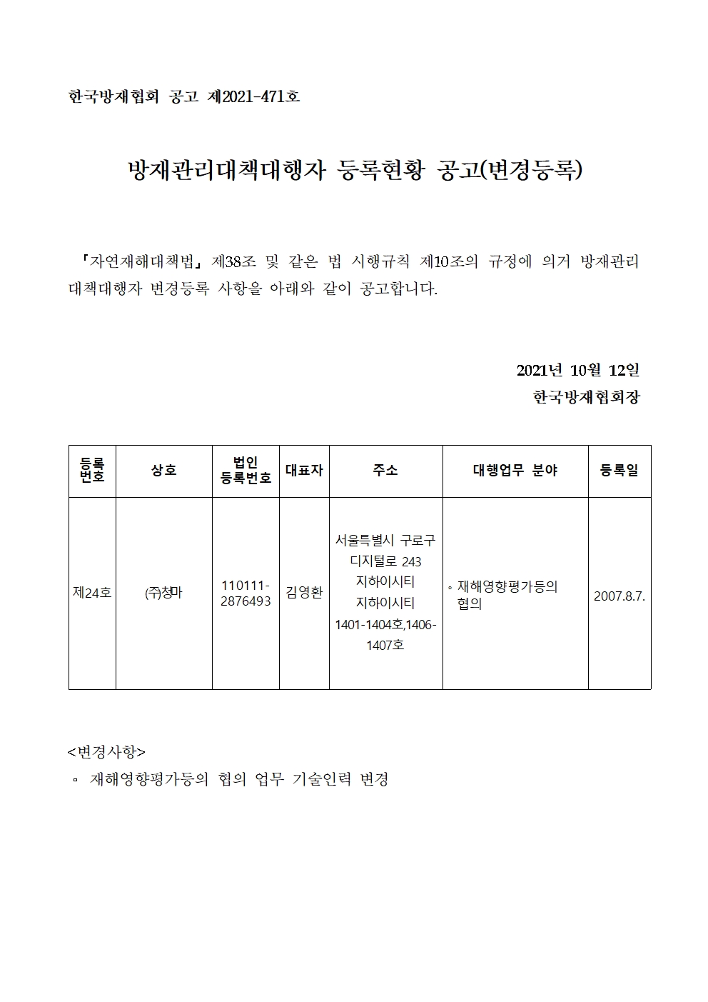 방재관리대책대행자 등록현황 공고(변경등록) - (주)청마 2021-10-12 공고문_제2021-471호_방재대행자 등록현황 공고(변경)_(주)청마.pdf (56807K) 목록보기 이전글방재관리대책대행자 등록현황 공고(변경등록) - (주)명성엔지니어링종합건축사사무소2021.10.12 다음글방재관리대책대행자 등록현황 공고(변경등록) - (주)경원엔지니어링건축사사무소2021.10.12