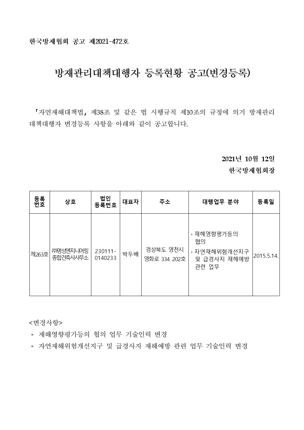 방재관리대책대행자 등록현황 공고(변경등록) - (주)명성엔지니어링종합건축사사무소 2021-10-12 공고문_제2021-472호_방재대행자 등록현황 공고(변경)_(주)명성엔지니어링종합건축사사무소.pdf (62872K) 목록보기 이전글방재관리대책대행자 등록현황 공고(변경등록) - (주)내경엔지니어링2021.10.12 다음글방재관리대책대행자 등록현황 공고(변경등록) - (주)청마2021.10.12