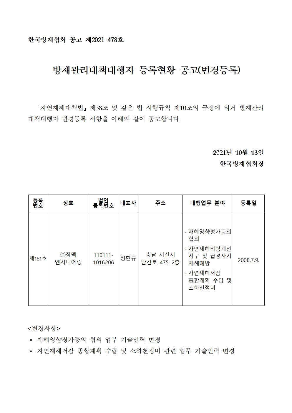 방재관리대책대행자 등록현황 공고(변경등록) - (주)장맥엔지니어링 2021-10-13 공고문_제2021-478호_방재대행자 등록현황 공고(변경)_(주)장맥엔지니어링.pdf (65541K) 목록보기 이전글방재관리대책대행자 등록현황 공고(변경등록) - (주)케이알티씨2021.10.13 다음글방재관리대책대행자 등록현황 공고(변경등록) - (주)라움이엔씨2021.10.13