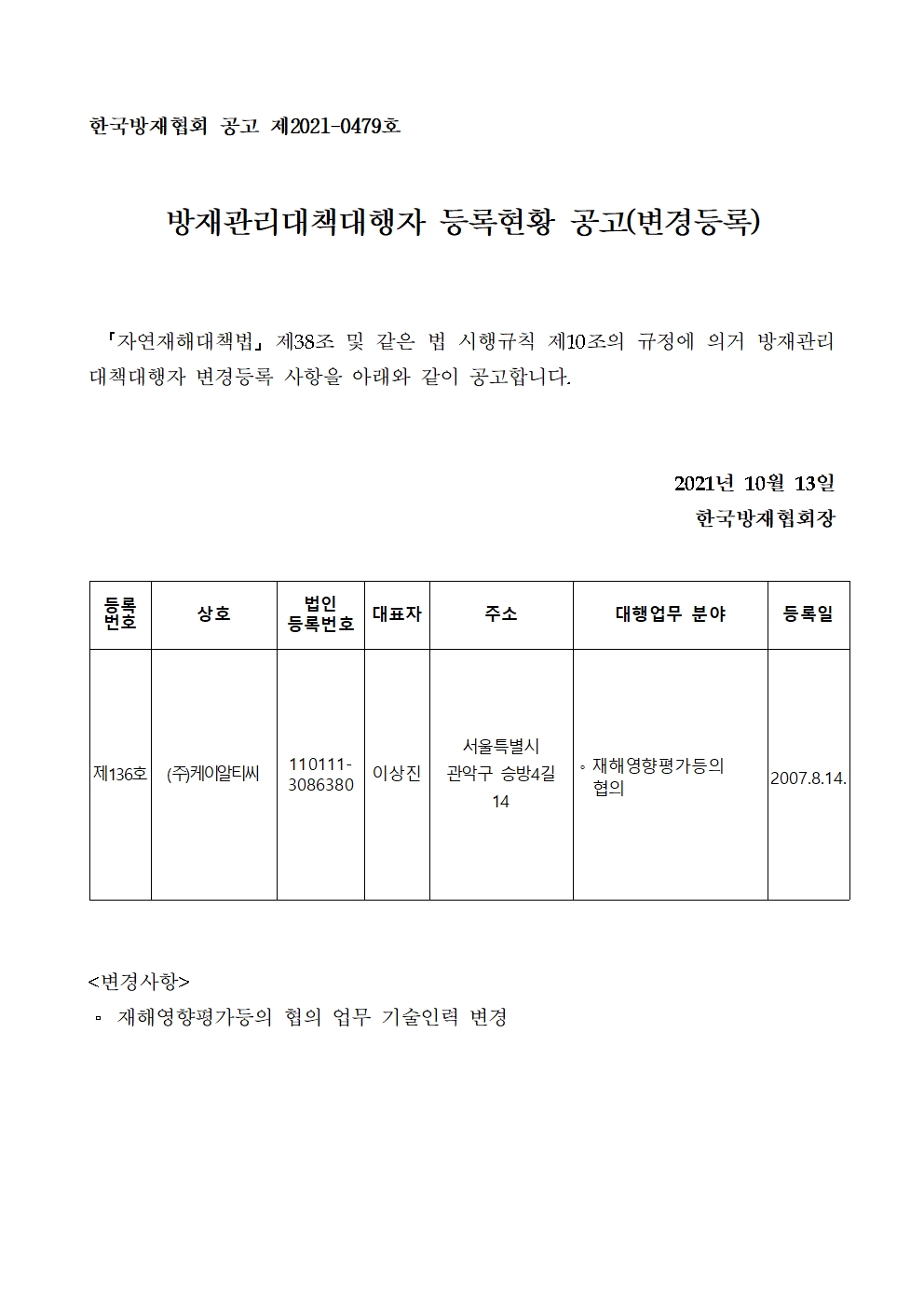 방재관리대책대행자 등록현황 공고(변경등록) - (주)케이알티씨 2021-10-13 공고문_제2021-479호_방재대행자 등록현황 공고(변경)_(주)케이알티씨.pdf (57535K) 목록보기 이전글방재관리대책대행자 등록현황 공고(변경등록) - (주)고려엔지니어링2021.10.13 다음글방재관리대책대행자 등록현황 공고(변경등록) - (주)장맥엔지니어링2021.10.13