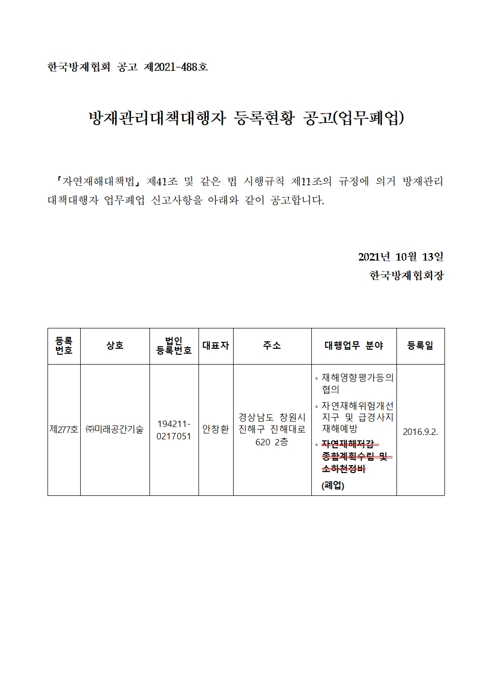 방재관리대책대행자 등록현황 공고(업무폐업) - (주)미래공간기술 2021-10-13 공고문_제2021-488호_방재대행자 등록현황 공고(폐업)_주식회사 미래공간기술.pdf (62147K) 목록보기 이전글방재관리대책대행자 등록현황 공고(변경등록) - (주)세원이앤이2021.10.14 다음글방재관리대책대행자 등록현황 공고(변경등록) - (주)미래공간기술2021.10.13