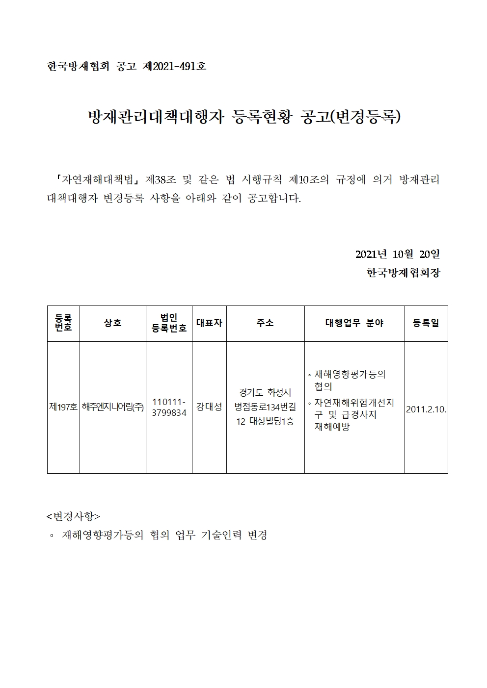 방재관리대책대행자 등록현황 공고(변경등록) - (주)해주엔지니어링 2021-10-20 공고문_제2021-491호_방재대행자 등록현황 공고(변경)_(주)해주엔지니어링.pdf (60490K) 목록보기 이전글방재관리대책대행자 등록현황 공고(변경등록) - (주)서영엔지니어링2021.10.20 다음글방재관리대책대행자 등록현황 공고(변경등록) - (주)정원엔지니어링2021.10.20