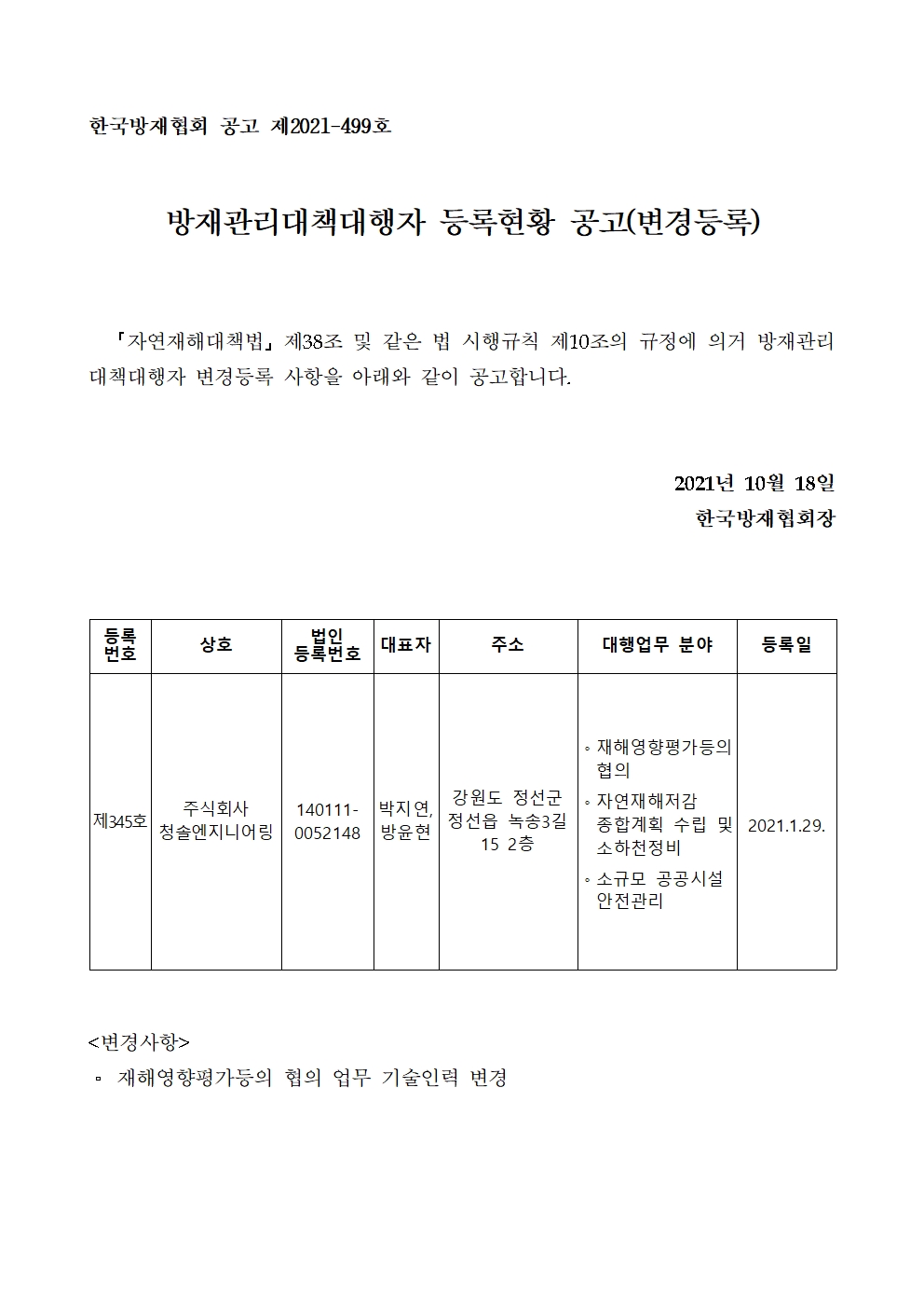 방재관리대책대행자 등록현황 공고(변경등록) - 주식회사 청솔엔지니어링 2021-10-20 공고문_제2021-499호_방재대행자 등록현황 공고(변경)_주식회사_청솔엔지니어링.pdf (64246K) 목록보기 이전글방재관리대책대행자 등록현황 공고(변경등록) - 주식회사동해2021.10.20 다음글방재관리대책대행자 등록현황 공고(변경등록) - (주)전엔지니어링2021.10.20