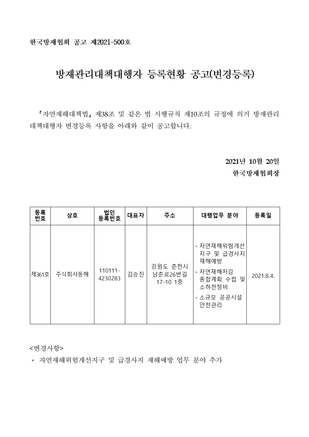 방재관리대책대행자 등록현황 공고(변경등록) - 주식회사동해 2021-10-20 공고문_제2021-500호_방재대행자 등록현황 공고(변경)_주식회사동해.pdf (62503K) 목록보기 이전글방재관리대책대행자 등록현황 공고(변경등록) - (주)금경엔지니어링2021.10.21 다음글방재관리대책대행자 등록현황 공고(변경등록) - 주식회사 청솔엔지니어링2021.10.20