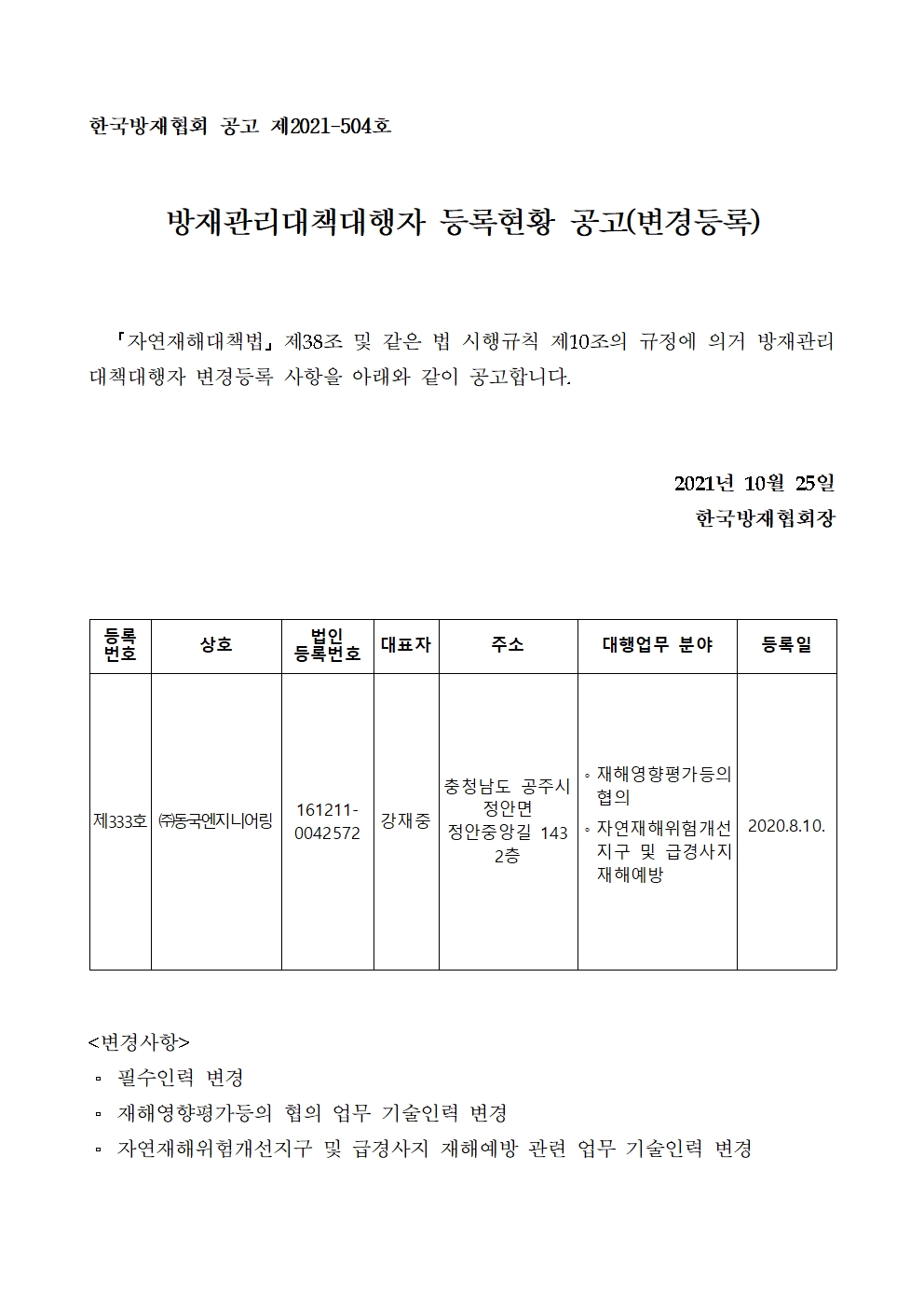방재관리대책대행자 등록현황 공고(변경등록) - (주)동국엔지니어링 2021-10-25 공고문_제2021-504호_방재대행자 등록현황 공고(변경)_(주)동국엔지니어링.pdf (63372K) 목록보기 이전글방재관리대책대행자 등록현황 공고(변경등록) - (주)도담이앤씨2021.10.25 다음글방재관리대책대행자 등록현황 공고(변경등록) - (주)신명건설기술공사2021.10.21
