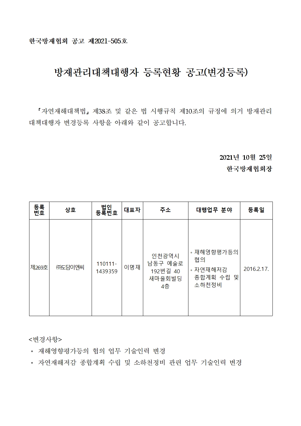 방재관리대책대행자 등록현황 공고(변경등록) - (주)도담이앤씨 2021-10-25 공고문_제2021-505호_방재대행자 등록현황 공고(변경)_(주)도담이앤씨.pdf (64848K) 목록보기 이전글방재관리대책대행자 등록현황 공고(변경등록) - 동부엔지니어링(주)2021.10.25 다음글방재관리대책대행자 등록현황 공고(변경등록) - (주)동국엔지니어링2021.10.25