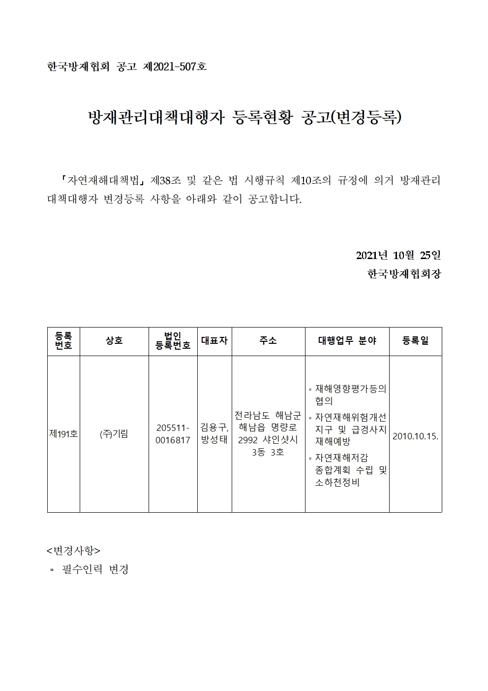 방재관리대책대행자 등록현황 공고(변경등록) - (주)기림 2021-10-25 공고문_제2021-507호_방재대행자 등록현황 공고(변경)_(주)기림.pdf (62490K) 목록보기 이전글방재관리대책대행자 등록현황 공고(변경등록) - (주)동국기술단2021.10.25 다음글방재관리대책대행자 등록현황 공고(변경등록) - 동부엔지니어링(주)2021.10.25