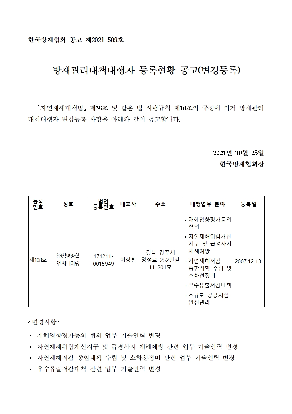 방재관리대책대행자 등록현황 공고(변경등록) - (주)청명종합엔지니어링 2021-10-25 공고문_제2021-509호_방재대행자 등록현황 공고(변경)_(주)청명종합엔지니어링.pdf (70379K) 목록보기 이전글방재관리대책대행자 등록현황 공고(변경등록) - (주)삼경2021.10.25 다음글방재관리대책대행자 등록현황 공고(변경등록) - (주)동국기술단2021.10.25
