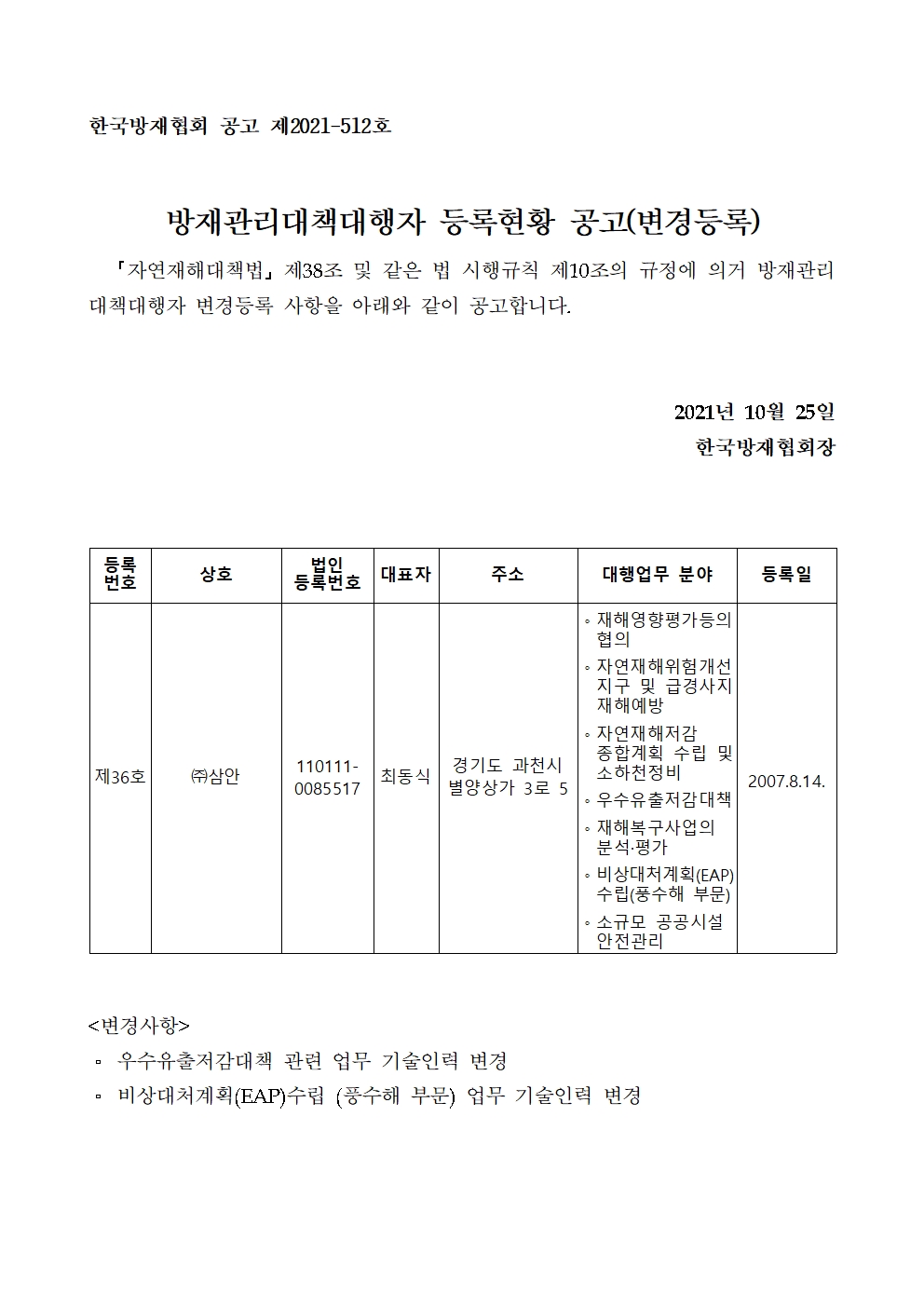방재관리대책대행자 등록현황 공고(변경등록) - (주)삼안 2021-10-25 공고문_제2021-512호_방재대행자 등록현황 공고(변경)_(주)삼안.pdf (70894K) 목록보기 이전글방재관리대책대행자 등록현황 공고(변경등록) - 산이건설(주)2021.10.25 다음글방재관리대책대행자 등록현황 공고(변경등록) - (주)장맥엔지니어링2021.10.25