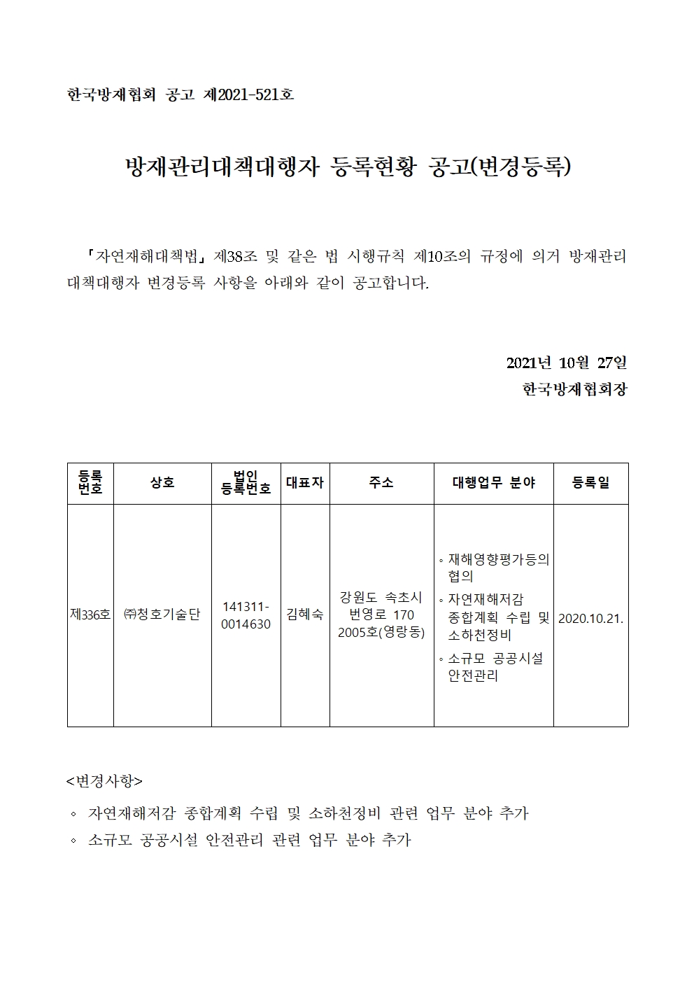 방재관리대책대행자 등록현황 공고(변경등록) - (주)청호기술단 2021-10-27 공고문_제2021-521호_방재대행자 등록현황 공고(변경)_(주)청호기술단-01.pdf (64893K) 목록보기 이전글방재관리대책대행자 등록현황 공고(변경등록) - (주)도화엔지니어링2021.10.27 다음글방재관리대책대행자 등록현황 공고(변경등록) - 주식회사 현산엔지니어링2021.10.27