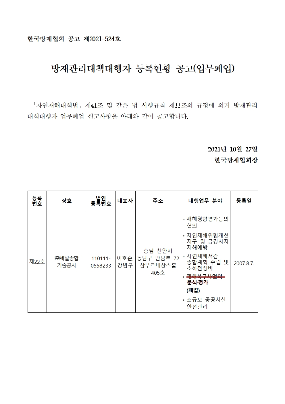 방재관리대책대행자 등록현황 공고(업무폐업) - (주)세일종합기술공사 2021-10-27 공고문_제2021-524호_방재대행자 등록현황 공고(폐업)_(주)세일종합기술공사.pdf (64754K) 목록보기 이전글방재관리대책대행자 등록현황 공고(변경등록) - (주)청강2021.10.27 다음글방재관리대책대행자 등록현황 공고(변경등록) - (주)세일종합기술공사2021.10.27