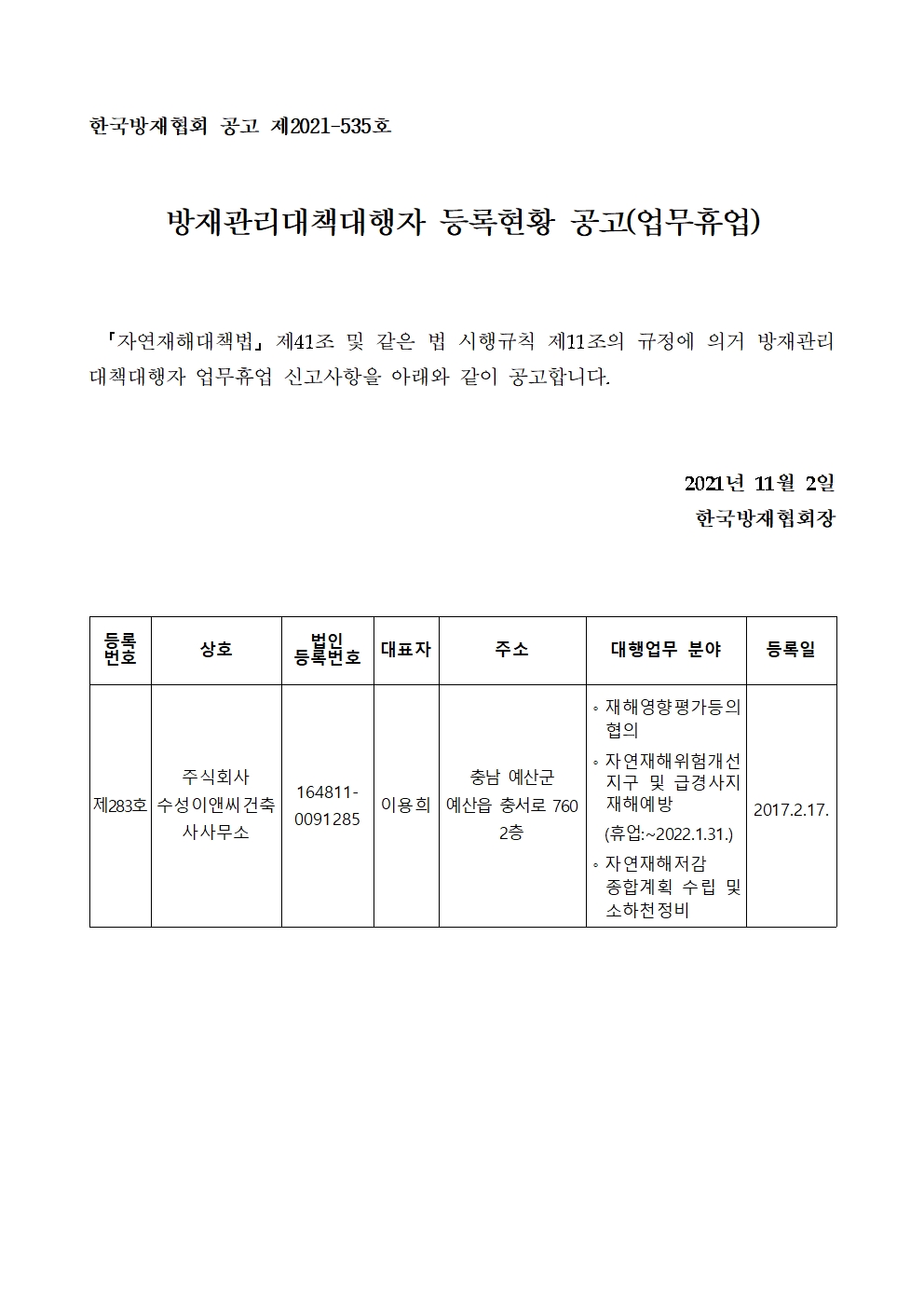 방재관리대책대행자 등록현황 공고(업무휴업) - 주식회사 수성이앤씨건축사사무소 2021-11-02 공고문_제2021_535호_방재대행자 등록현황 공고(휴업)_주식회사 수성이앤씨건축사사무소.pdf (60578K) 목록보기 이전글방재관리대책대행자 등록현황 공고(변경등록) - 주식회사 정안2021.11.02 다음글방재관리대책대행자 등록현황 공고(변경등록) - 주식회사 수성이앤씨건축사사무소2021.11.02