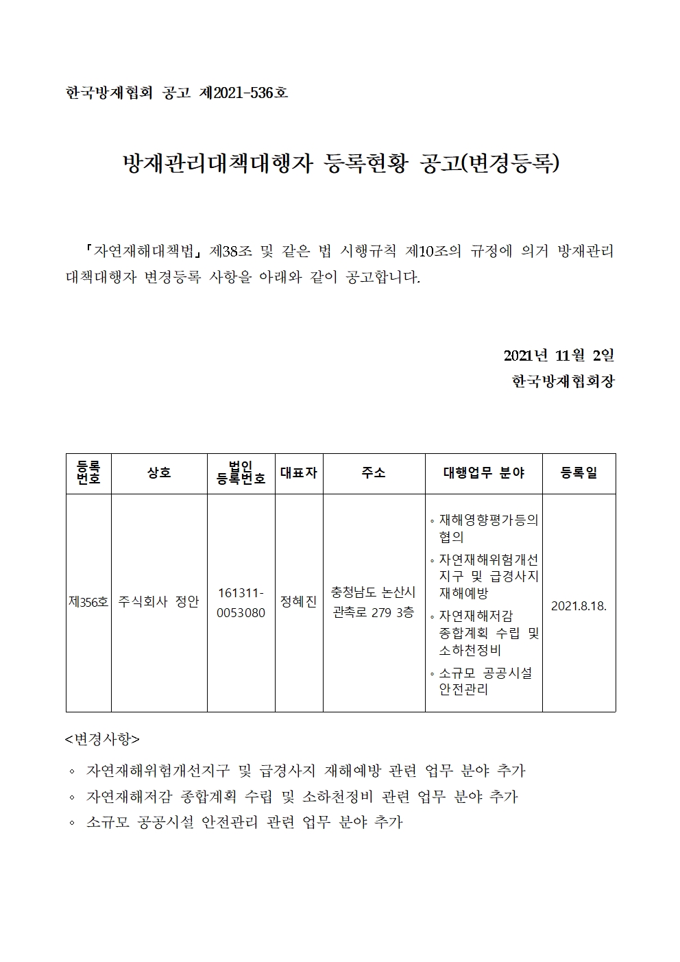 방재관리대책대행자 등록현황 공고(변경등록) - 주식회사 정안 2021-11-02 공고문_제2021-536호_방재대행자 등록현황 공고(변경)_정안-01.pdf (67422K) 목록보기 이전글방재관리대책대행자 등록현황 공고(변경등록) - (주)일신이앤씨2021.11.02 다음글방재관리대책대행자 등록현황 공고(업무휴업) - 주식회사 수성이앤씨건축사사무소2021.11.02