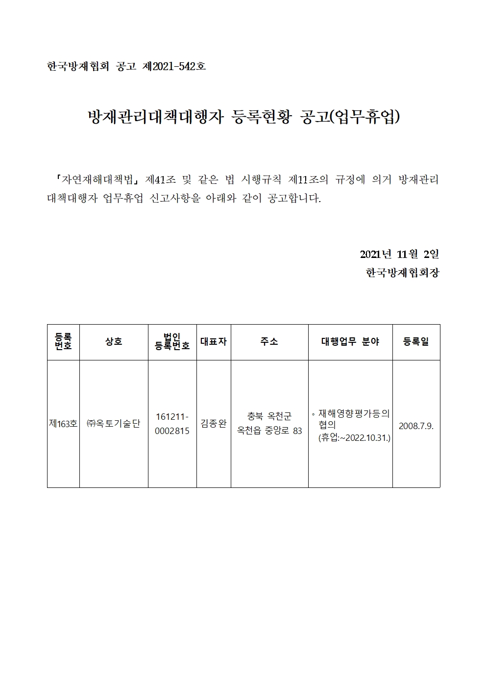 방재관리대책대행자 등록현황 공고(업무휴업) - (주)옥토기술단 2021-11-02 공고문_제2021-542호_방재대행자 등록현황 공고(휴업)_(주)옥토기술단.pdf (54285K) 목록보기 이전글방재관리대책대행자 등록현황 공고(변경등록) - 아람이엔씨(주)2021.11.08 다음글방재관리대책대행자 등록현황 공고(업무휴업) - (주)청마2021.11.02