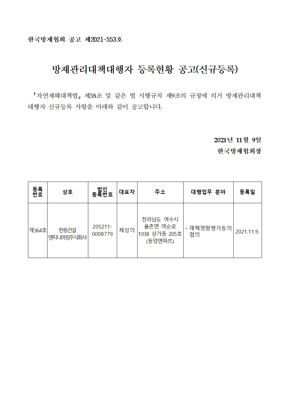 방재관리대책대행자 등록현황 공고(신규등록) - 한동건설엔지니어링 주식회사 2021-11-09 공고문_제2021-553호_방재대행자 등록현황 공고(신규)_(주)한동건설엔지니어링주식회사.pdf (56655K) 목록보기 이전글방재관리대책대행자 등록현황 공고(신규등록) - (주)유성이앤씨2021.11.09 다음글방재관리대책대행자 등록현황 공고(신규등록) - (주)하나기술단2021.11.09