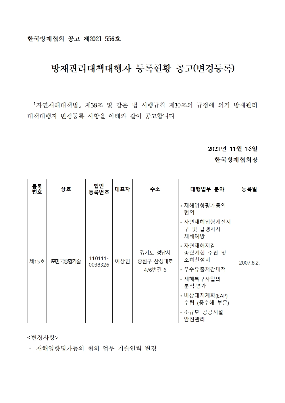 방재관리대책대행자 등록현황 공고(변경등록) - (주)한국종합기술 2021-11-16 공고문_제2021-556호_방재대행자 등록현황 공고(변경)_(주)한국종합기술.pdf (67729K) 목록보기 이전글방재관리대책대행자 등록현황 공고(변경등록) - 주식회사 이도2021.11.16 다음글방재관리대책대행자 등록현황 공고(신규등록) - (주)유성이앤씨2021.11.09