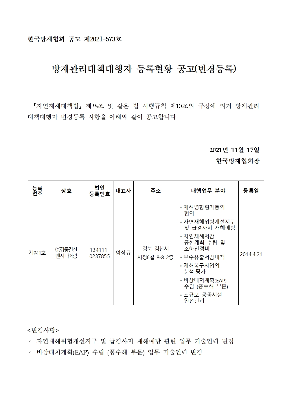 방재관리대책대행자 등록현황 공고(변경등록) - (주)강동건설엔지니어링 2021-11-17 공고문_제2021-573호_방재대행자 등록현황 공고(변경)_(주)강동건설엔지니어링.pdf (72342K) 목록보기 이전글방재관리대책대행자 등록현황 공고(변경등록) - 주식회사 유현이엔씨2021.11.18 다음글방재관리대책대행자 등록현황 공고(변경등록) - (주)세종방재연구소2021.11.17