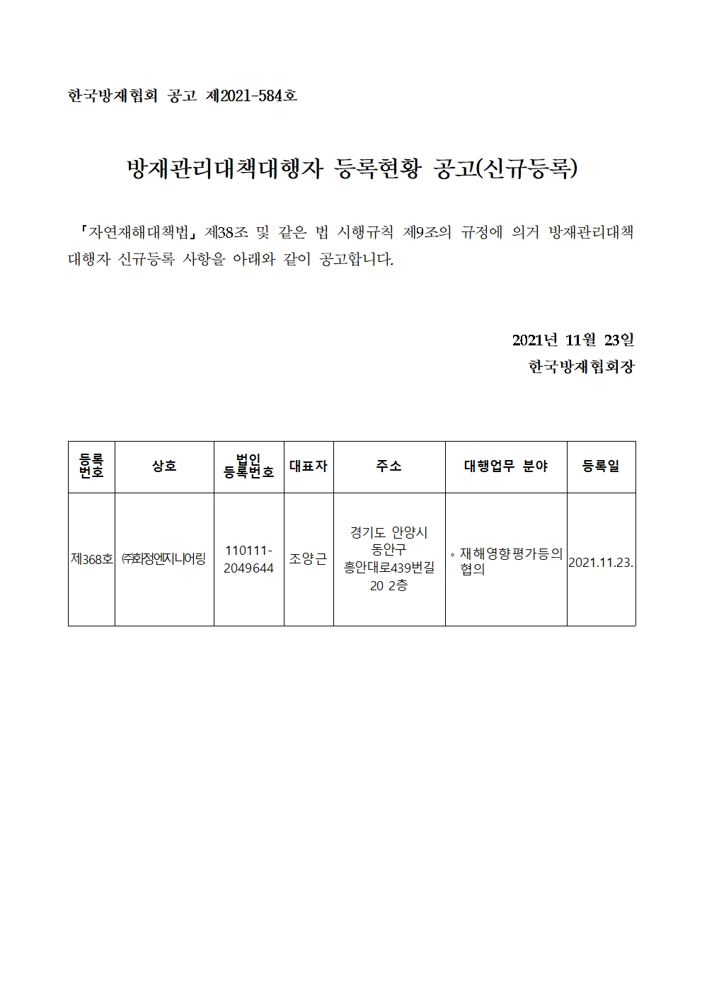 방재관리대책대행자 등록현황 공고(신규등록) - (주)화정엔지니어링 2021-11-23 공고문_제2021-584호_방재대행자 등록현황 공고(신규)_(주)화정엔지니어링-01.pdf (54949K) 목록보기 이전글방재관리대책대행자 등록현황 공고(신규등록) - 주식회사하이이앤씨2021.11.23 다음글방재관리대책대행자 등록현황 공고(신규등록) - (주)에스에스디이엔씨2021.11.23