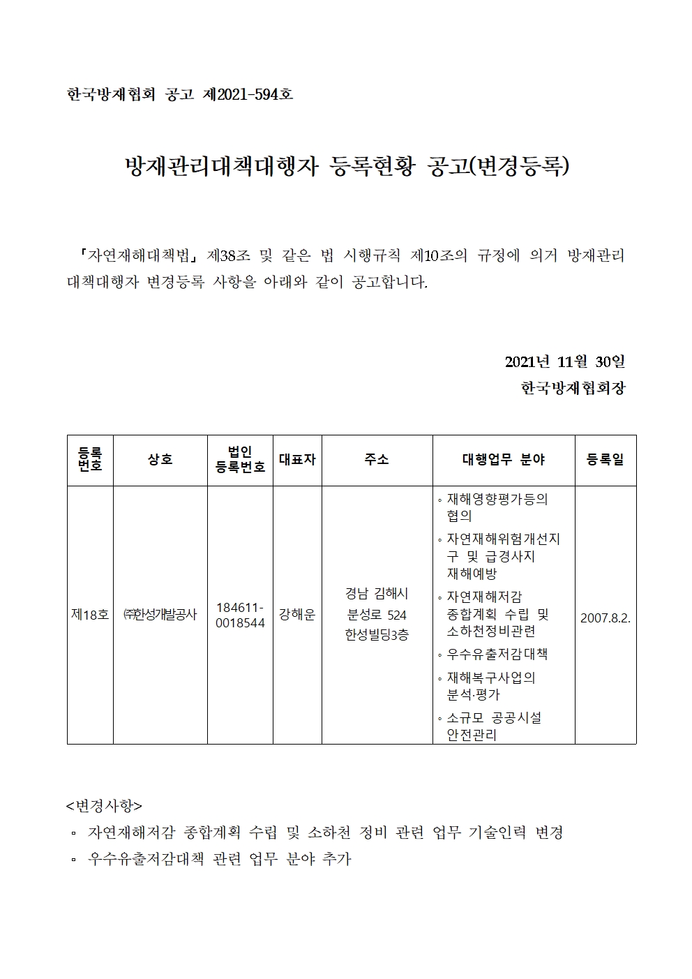 방재관리대책대행자 등록현황 공고(변경등록) - (주)한성개발공사 2021-11-30 공고문_제2021-594호_방재대행자 등록현황 공고(변경)_(주)한성개발공사.pdf (68893K) 목록보기 이전글방재관리대책대행자 등록현황 공고(변경등록) - 주식회사 유현이엔씨2021.12.01 다음글방재관리대책대행자 등록현황 공고(업무재개) - (주)청마2021.11.30