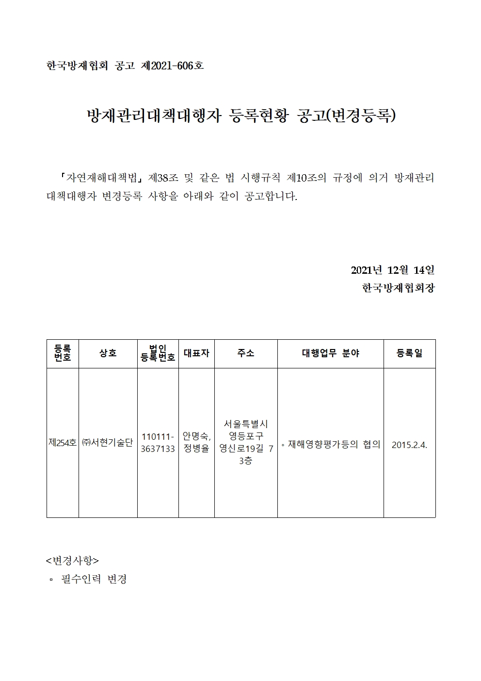 방재관리대책대행자 등록현황 공고(변경등록) - (주)서현기술단 2021-12-14 공고문_제2021-606호_방재대행자 등록현황 공고(변경)_(주)서현기술단.pdf (56913K) 목록보기 이전글방재관리대책대행자 등록현황 공고(변경등록) - 주식회사 해인엔지니어링건축사사무소2021.12.14 다음글방재관리대책대행자 등록현황 공고(업무재개) - 주식회사 수성이앤씨건축사사무소2021.12.08