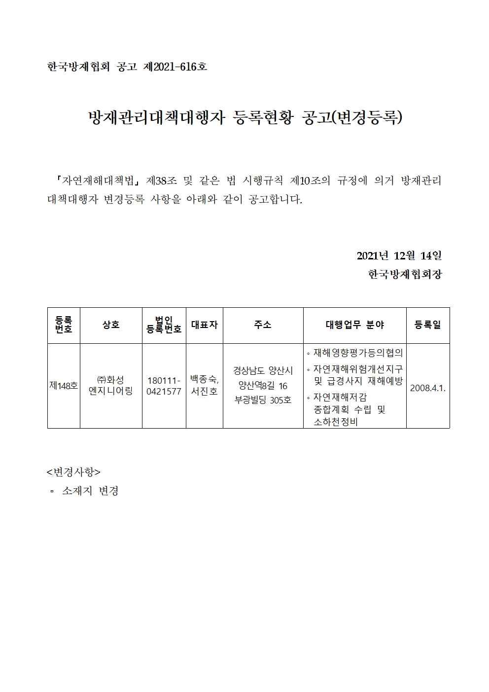 방재관리대책대행자 등록현황 공고(변경등록) - (주)화성엔지니어링 2021-12-14 공고문_제2021-616호_방재대행자 등록현황 공고(변경)_(주)화성엔지니어링.pdf (62339K) 목록보기 이전글방재관리대책대행자 등록현황 공고(변경등록) - (주)강우엔지니어링2021.12.14 다음글방재관리대책대행자 등록현황 공고(변경등록) - (주)인우2021.12.14